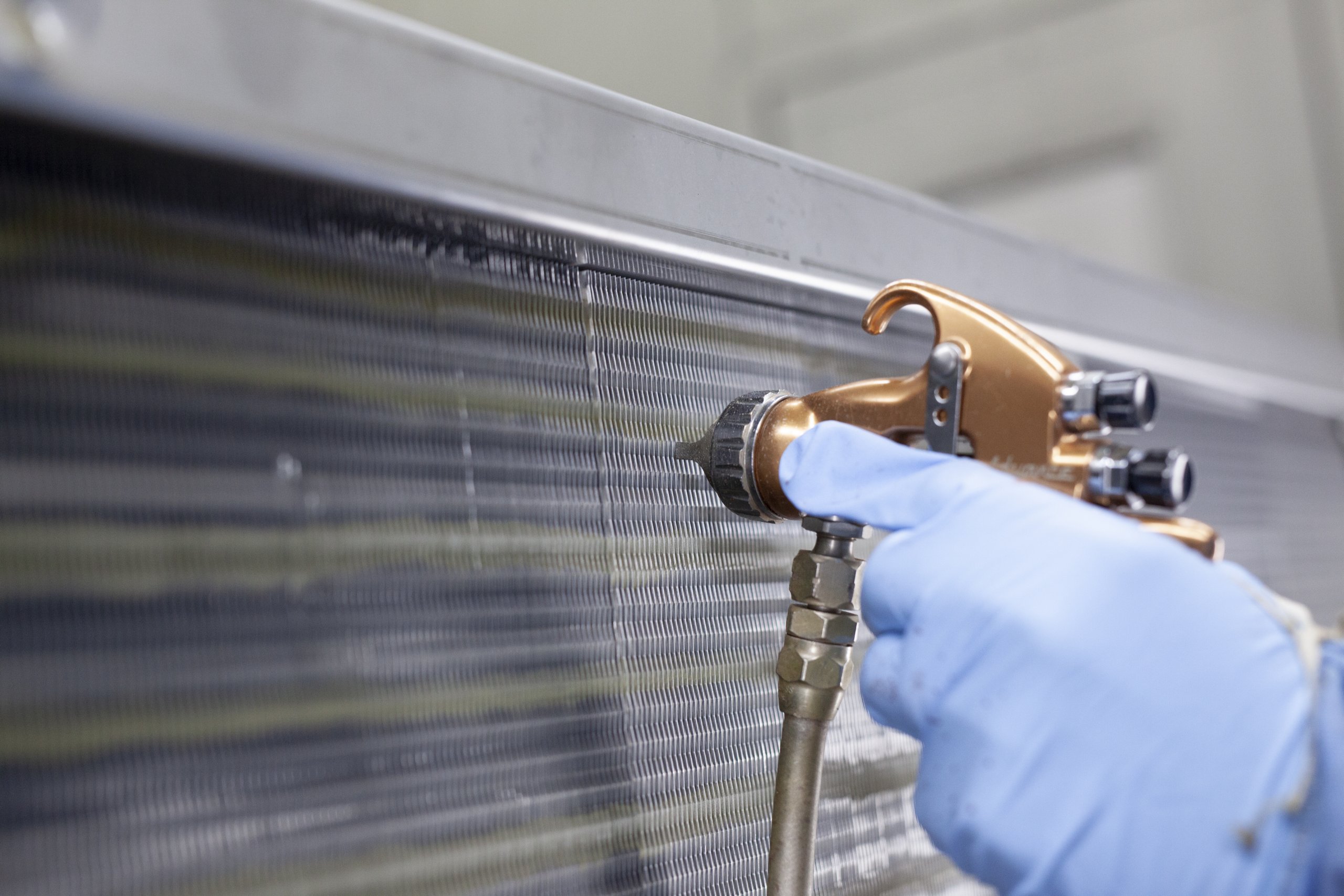 Quy trình sơn phủ tại hiện trường bao gồm bơm cấp khí cung cấp khí nén áp lực cao sau đó đưa đến bình phun. Quy trình này rất phổ biến, nhưng vẫn có những mức độ thành công khác nhau về phạm vi bao phủ và thâm nhập vào bên trong dàn coil. Ý kiến chung là một số phương pháp bảo vệ vẫn tốt hơn không có; tuổi thọ dàn coil nhôm trần không kéo dài trong môi trường ăn mòn.